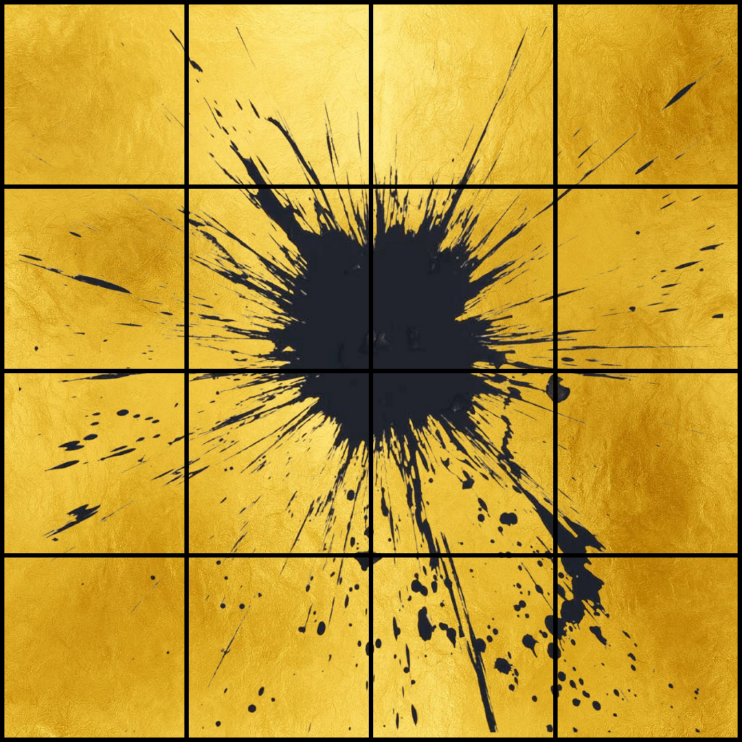 Un’opera collettiva composta da 16 pannelli quadrati quadrati da 50 x 50 cm affiancati per formare una superficie 2 x 2 metri interamente rivestita in foglia d’oro.